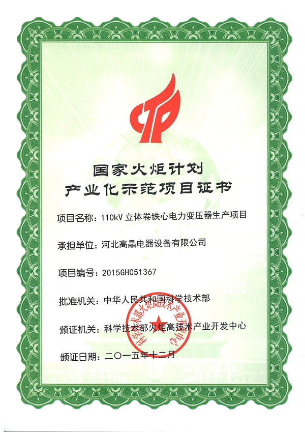 After city and county federations positive declaration, Hebei Gao Jing Electrical Equipment Co., Ltd. "110kV three-dimensional wound core power transformer production project" was included in the 2015 National Torch Program.